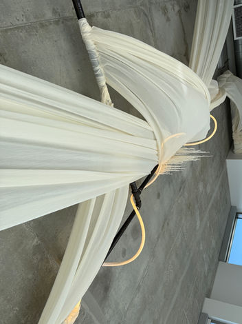 The ceiling installation - composed of fluid ivory chiffon, cascading white amaranthus, and a thread of LED rope light - is loosely intertwined in an organic, intuitive movement that sets the tone for this meditative space. The light flows through the fabric like energy, glowing gently from within the composition.